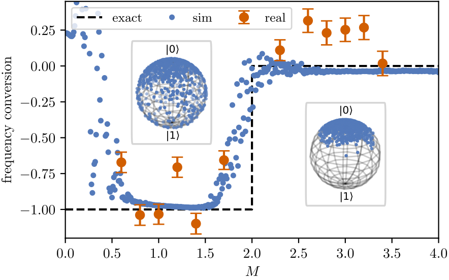 As a first step, Adam Smith and I did an experiment with continuous driving of a single superconducting qubit with two incommensurate frequencies [3]. Confirming earlier predictions, this reveals a temporal topological band structure, which ultimately results in topological frequency conversion. The underlying physics is related to another one of my other research interest: periodically driven systems.